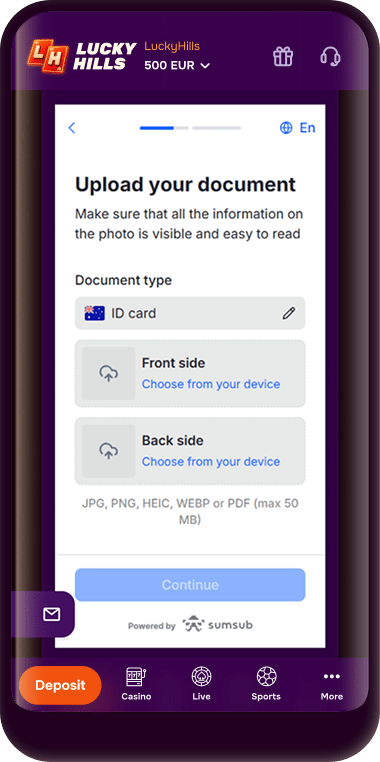 If the system didn’t verify your identity or you have difficulty completing the form, please contact our support team at support@luckyhills.club